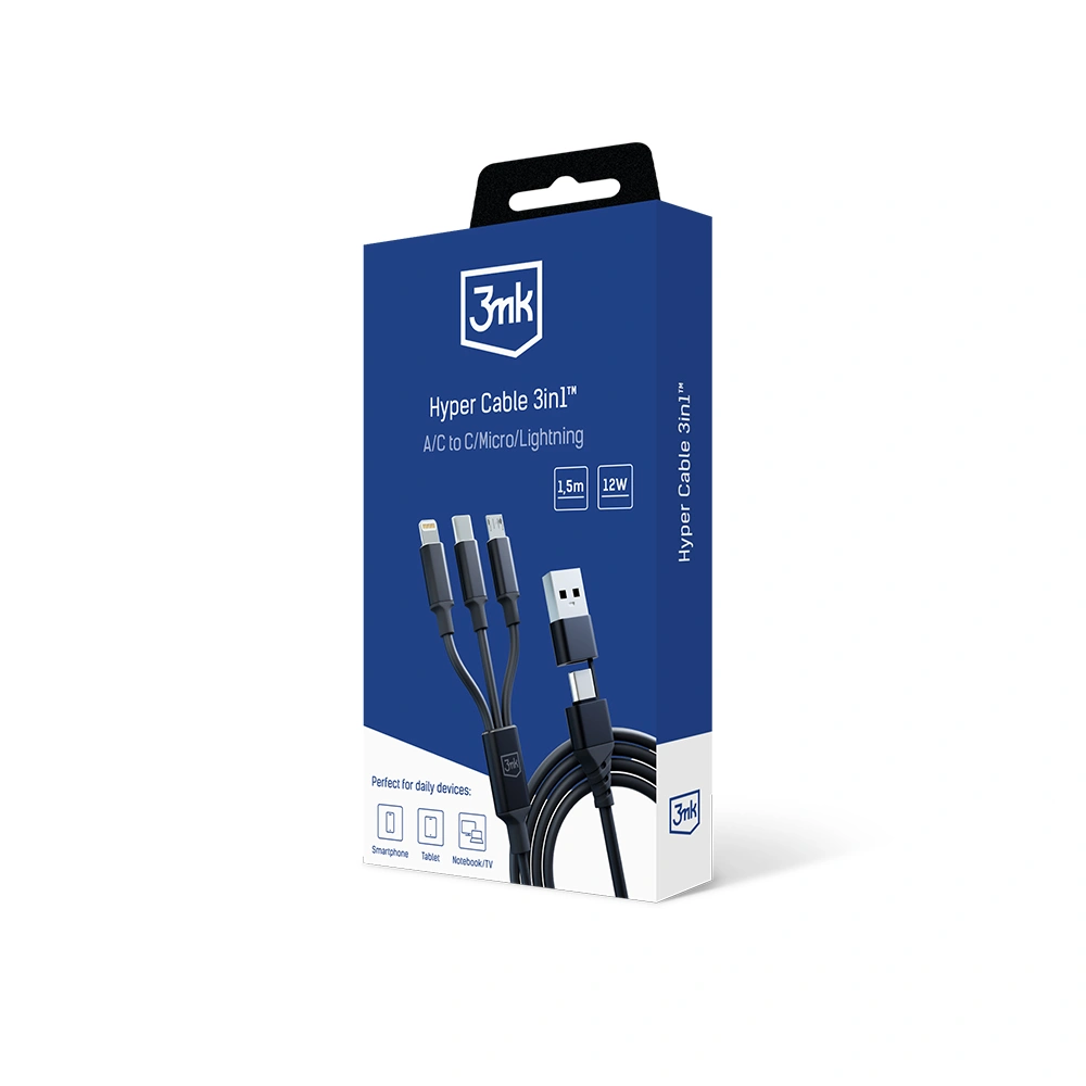 Hyper Cable 3in1™ are o lungime perfect echilibrată de 1,5 metri. Datorită acesteia, oferă libertate în utilizarea dispozitivelor în timpul încărcării. Cablul confortabil de lung nu obligă utilizatorul să stea cu telefonul pe podea lângă priză. Se poate relaxa și își poate folosi smartphone-ul în mod confortabil.